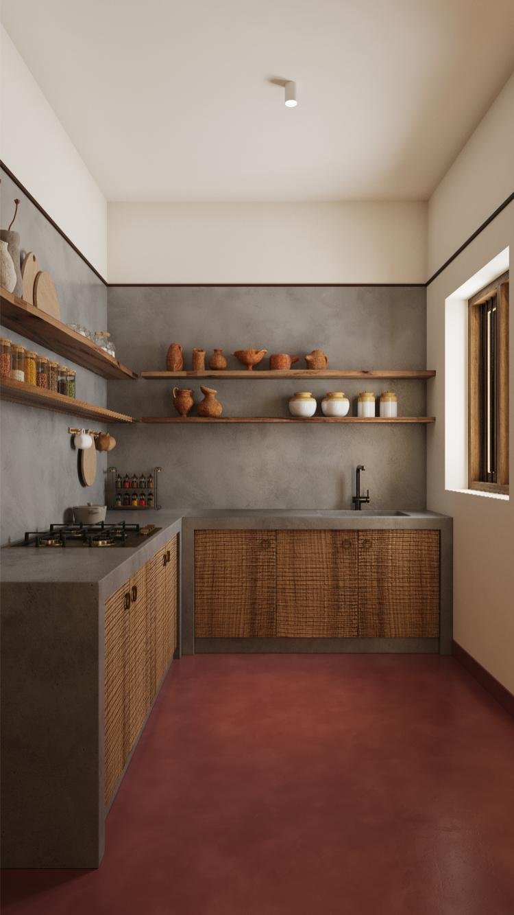 The wooden shelves are separated by a black column. Its bold embossed texture adds a subtle brutalism that balances the design ensemble well and resembles powerful tarred pillars in old Ukrainian villages.